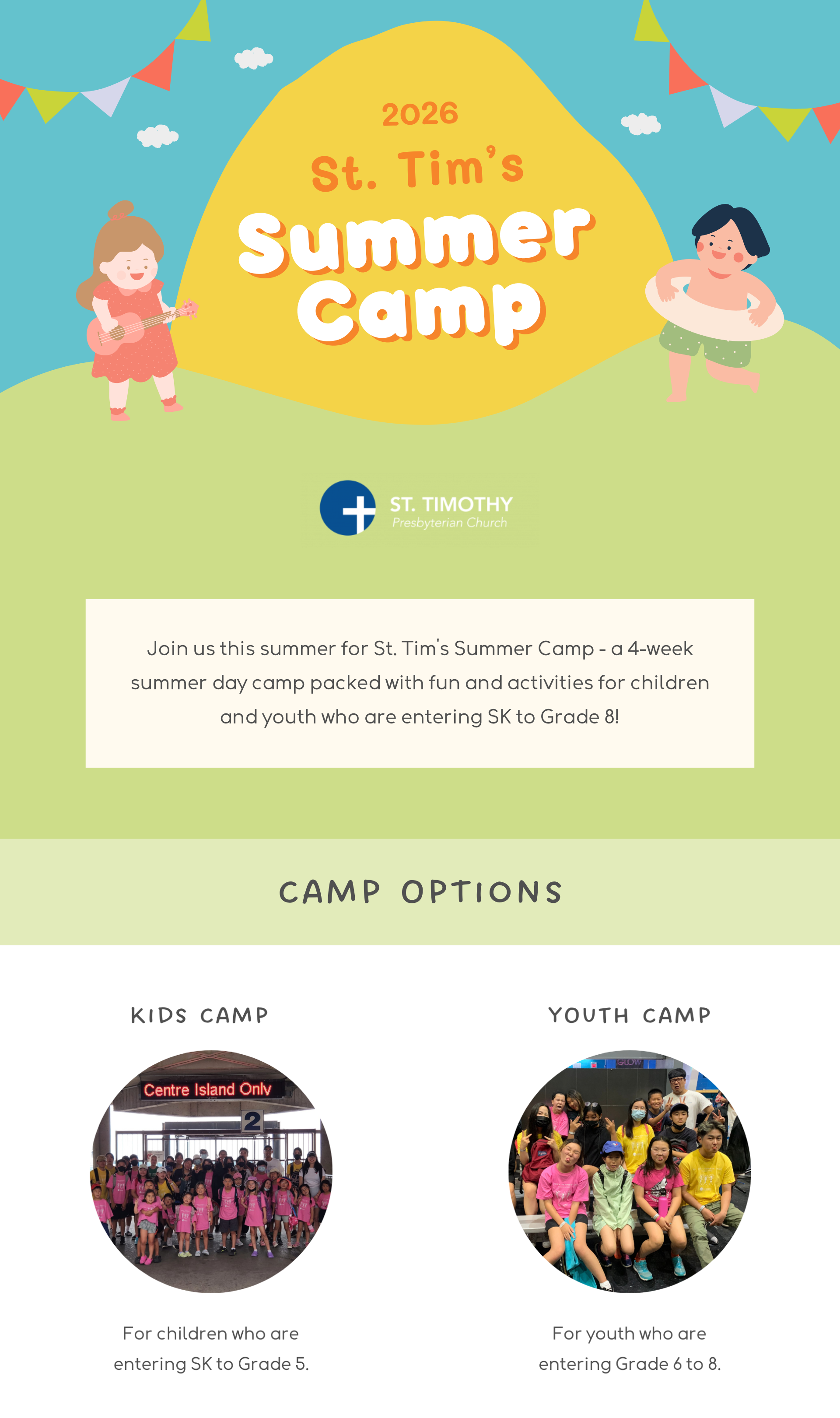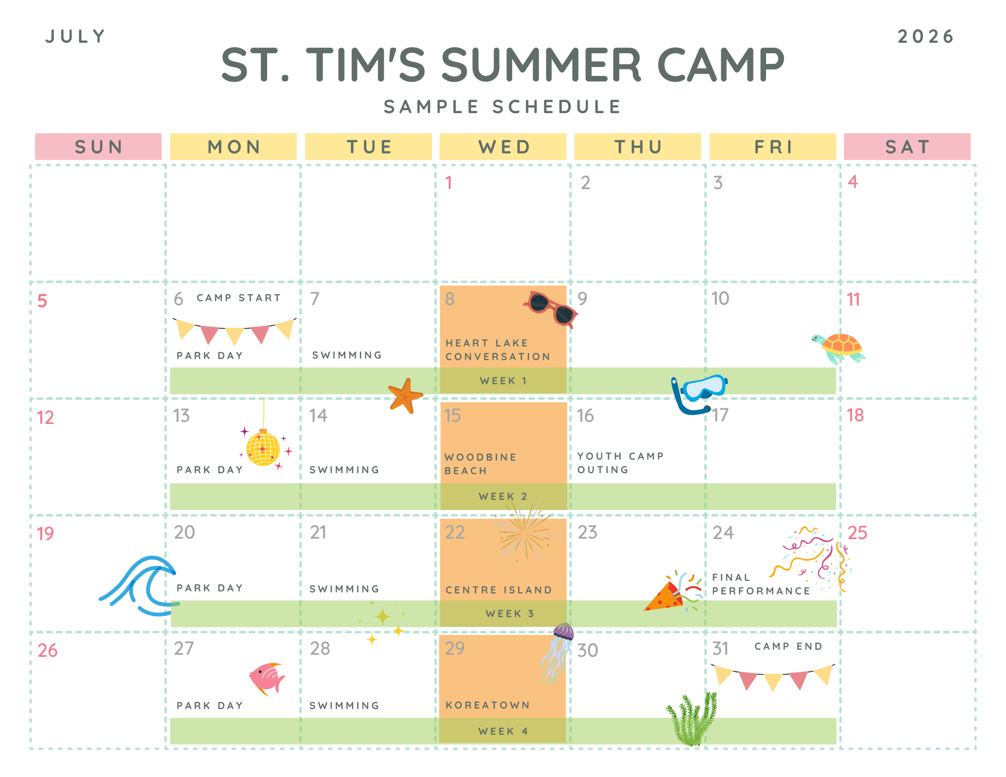 Our main goal for this summer camp is to share God's love. The school year is busy and full of many activities. During the summer, we want our children to experience the joy of being children and being loved for who they are. Our counsellors' main job is to love the kids in a safe, fun and nurturing environment!