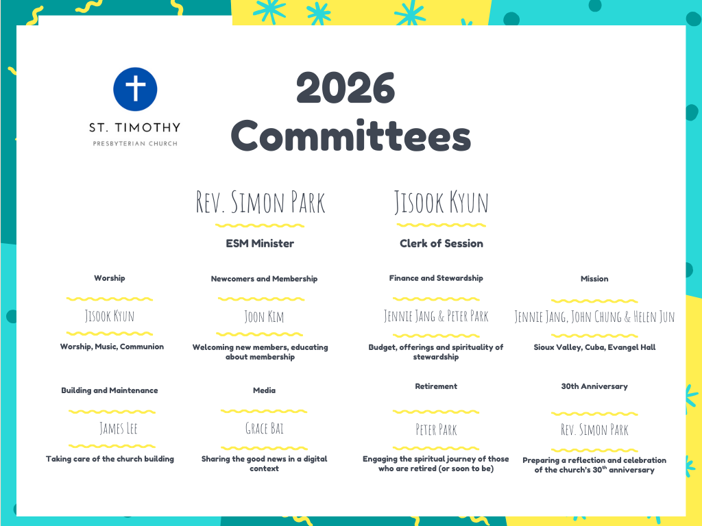 Please consider serving on a committee in 2026! God has given everyone unique gifts to serve others. Make 2026 a special year of cultivating your God-given gifts for the church!