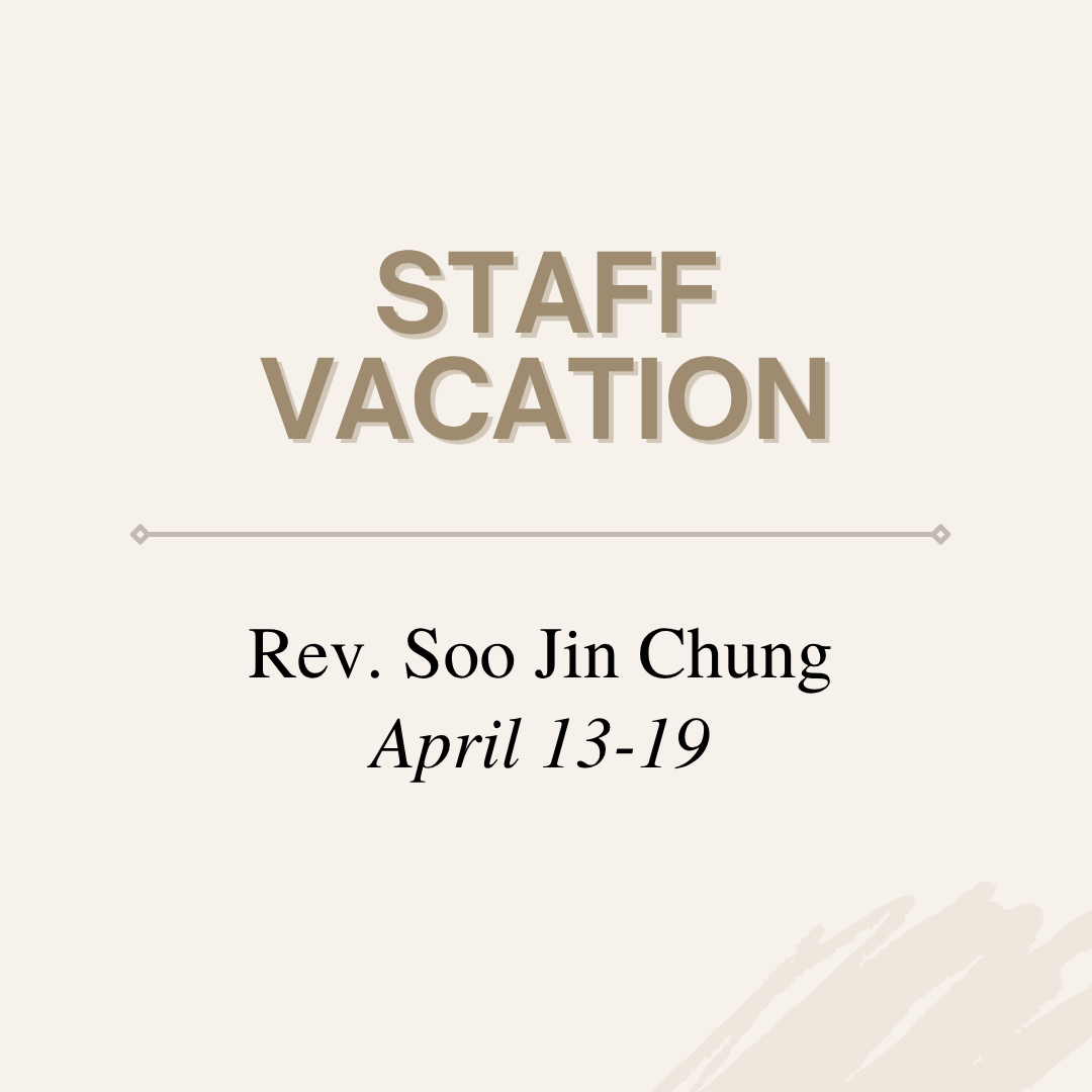 Rev. Soo Jin Chung will be on vacation this week, let us pray for a well-deserved rest!