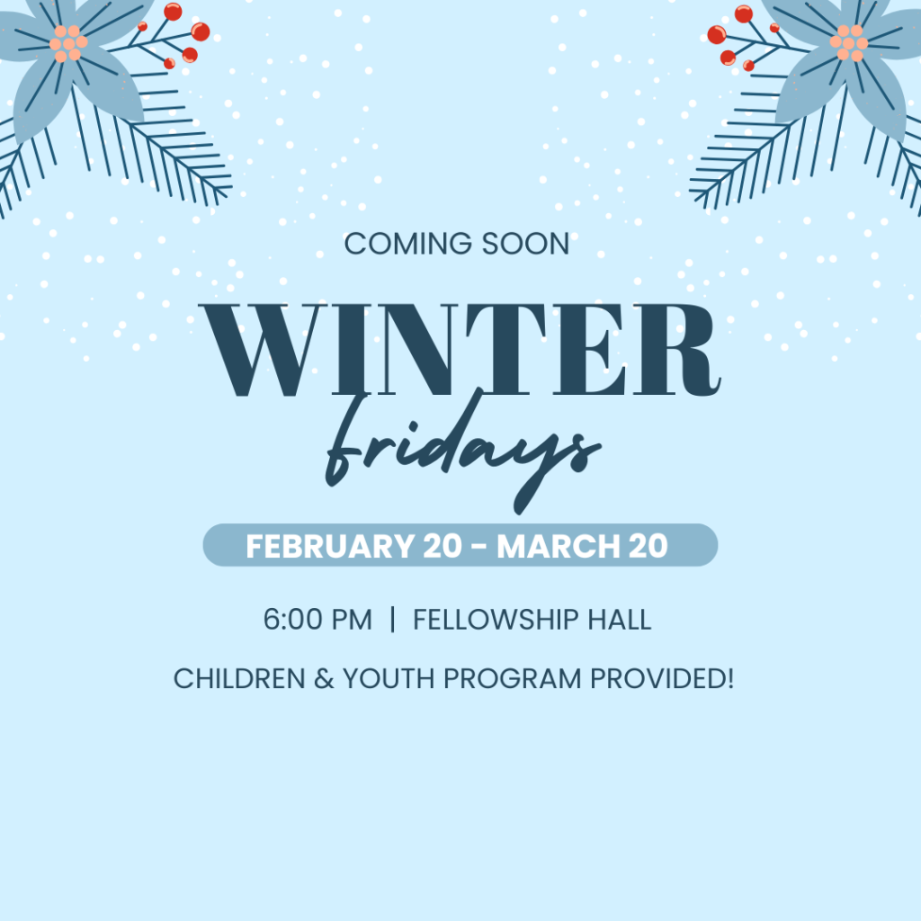 Winter Fridays is coming back! Please join us on Fridays from February 20 – March 20 @ 6pm in the fellowship hall for what will be a great intergenerational gathering and a Lenten-themed Bible study. Save the dates and stay tuned for more details in the coming weeks!