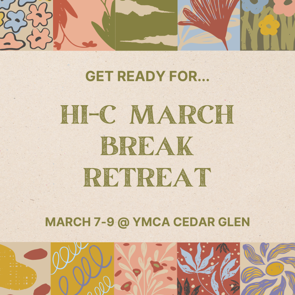 Hi-C! Please join us for the March Break retreat on March 7-9 @ YMCA Cedar Glen! It will be a great time of connection and fellowship. Please reach out to your execs if you have any questions!