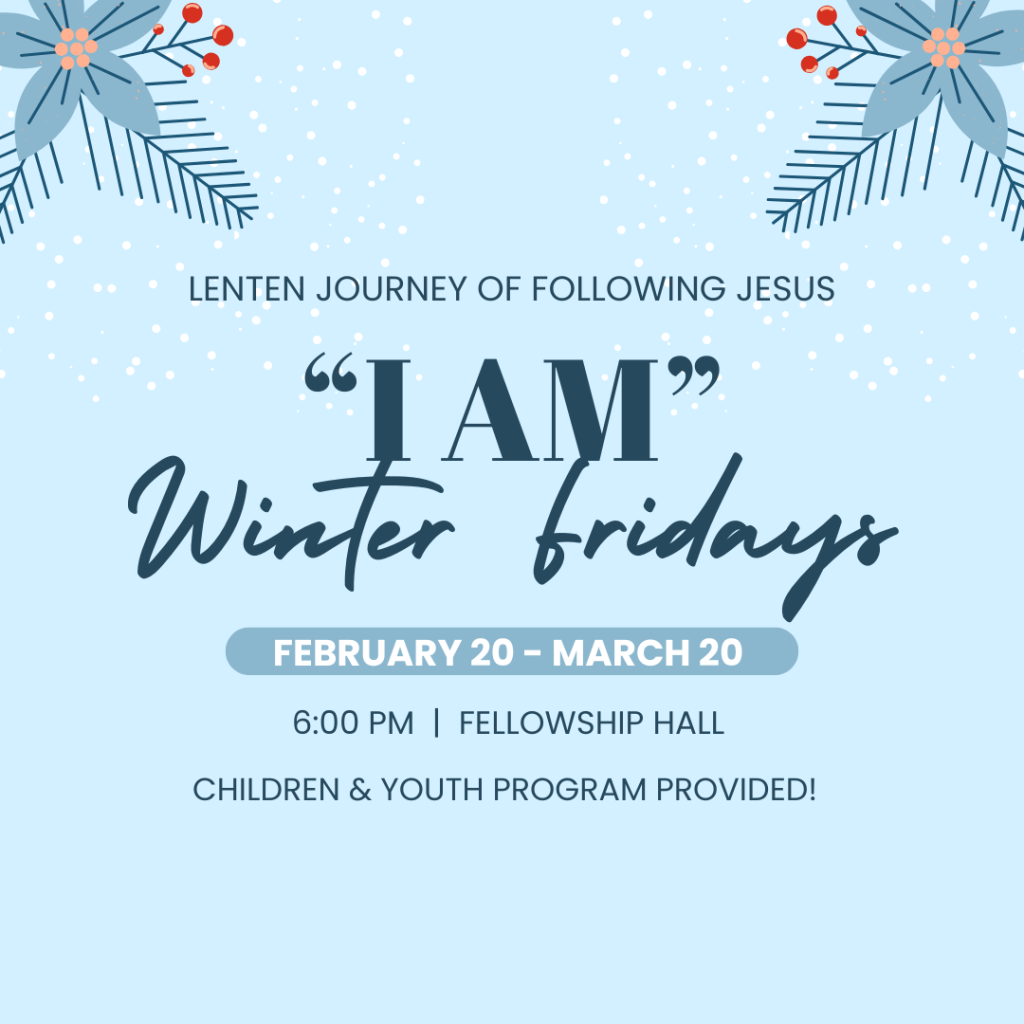 Winter Fridays is coming back! Please join us on Fridays from February 20 – March 20 @ 6pm in the fellowship hall. This will be a special intergenerational journey through the weeks of Lent. We will journey into the identity of Jesus through his “I Am” statements in the Gospel of John.