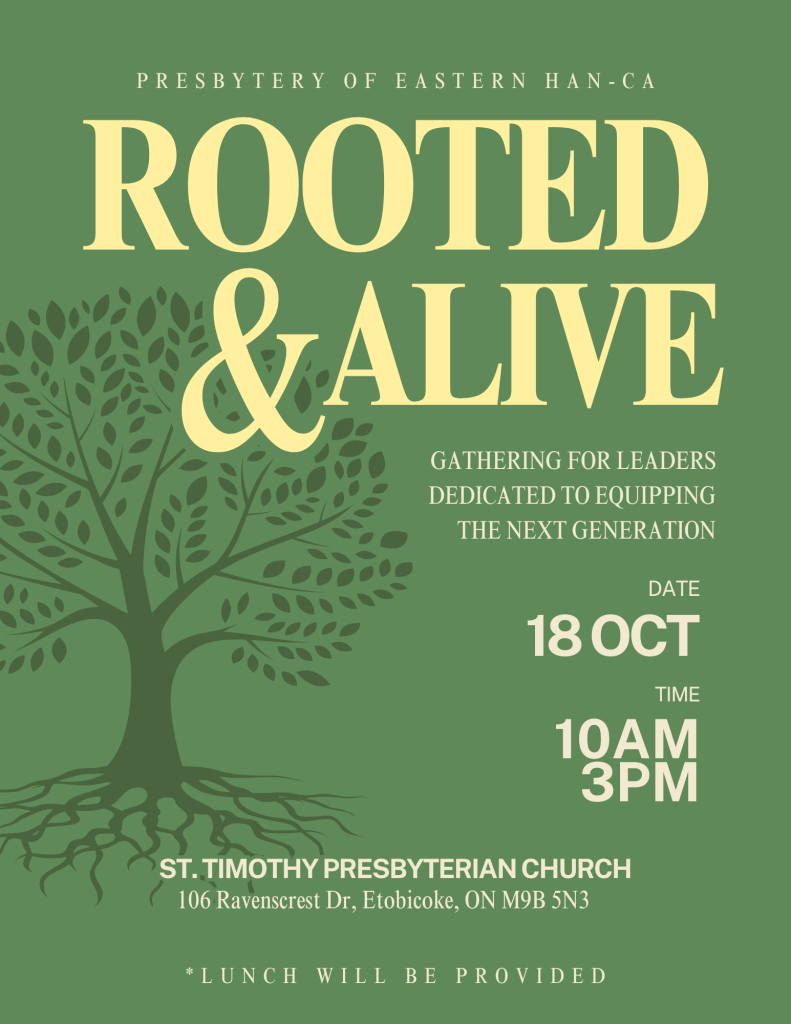 We will be hosting Rooted & Alive, a gathering for the Presbytery of Eastern Han-Ca on October 18 @ 10am-3pm.